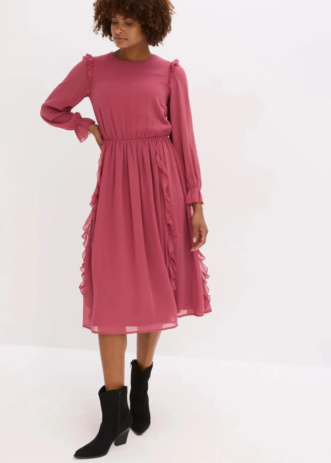 feminines Chiffonkleid in Midilänge mit modischen Volants an der Schulter, am Ärmelsaum und am Rockteil