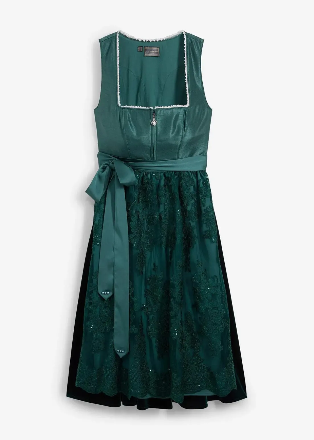 edles Dirndl mit Mieder in Wildseidenoptik, Perlen am Ausschnitt, schimmernden Samtrock und elegant bestickter Schürze