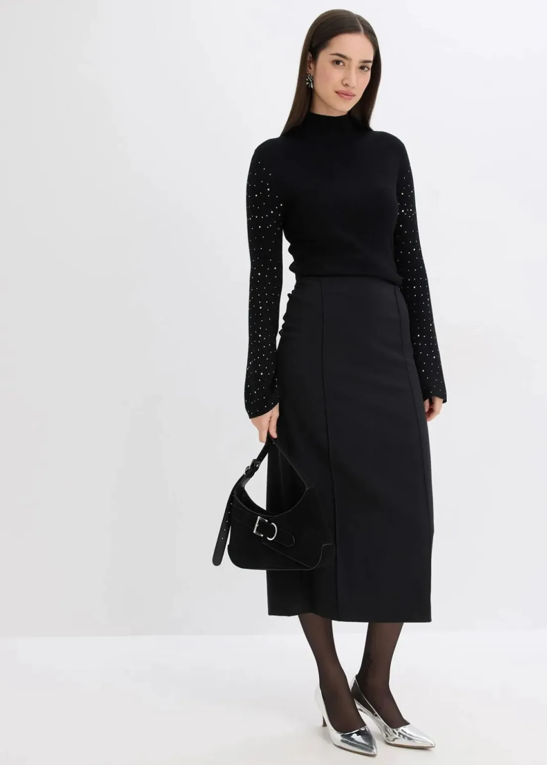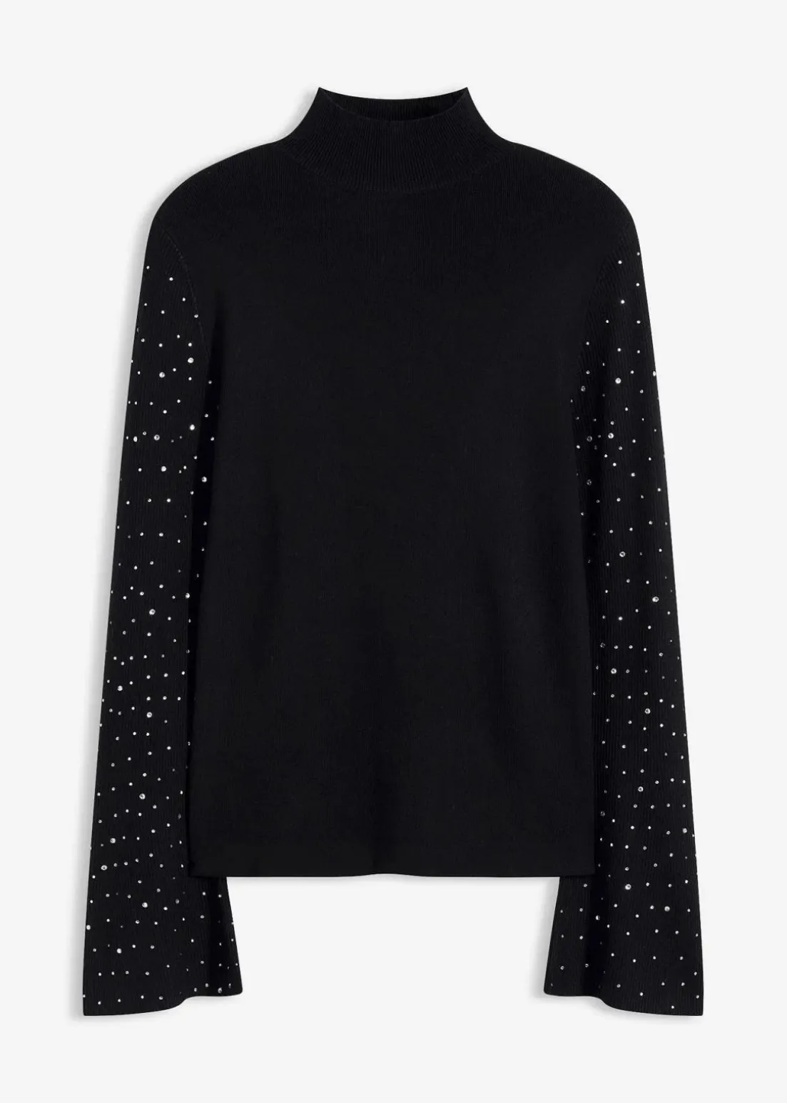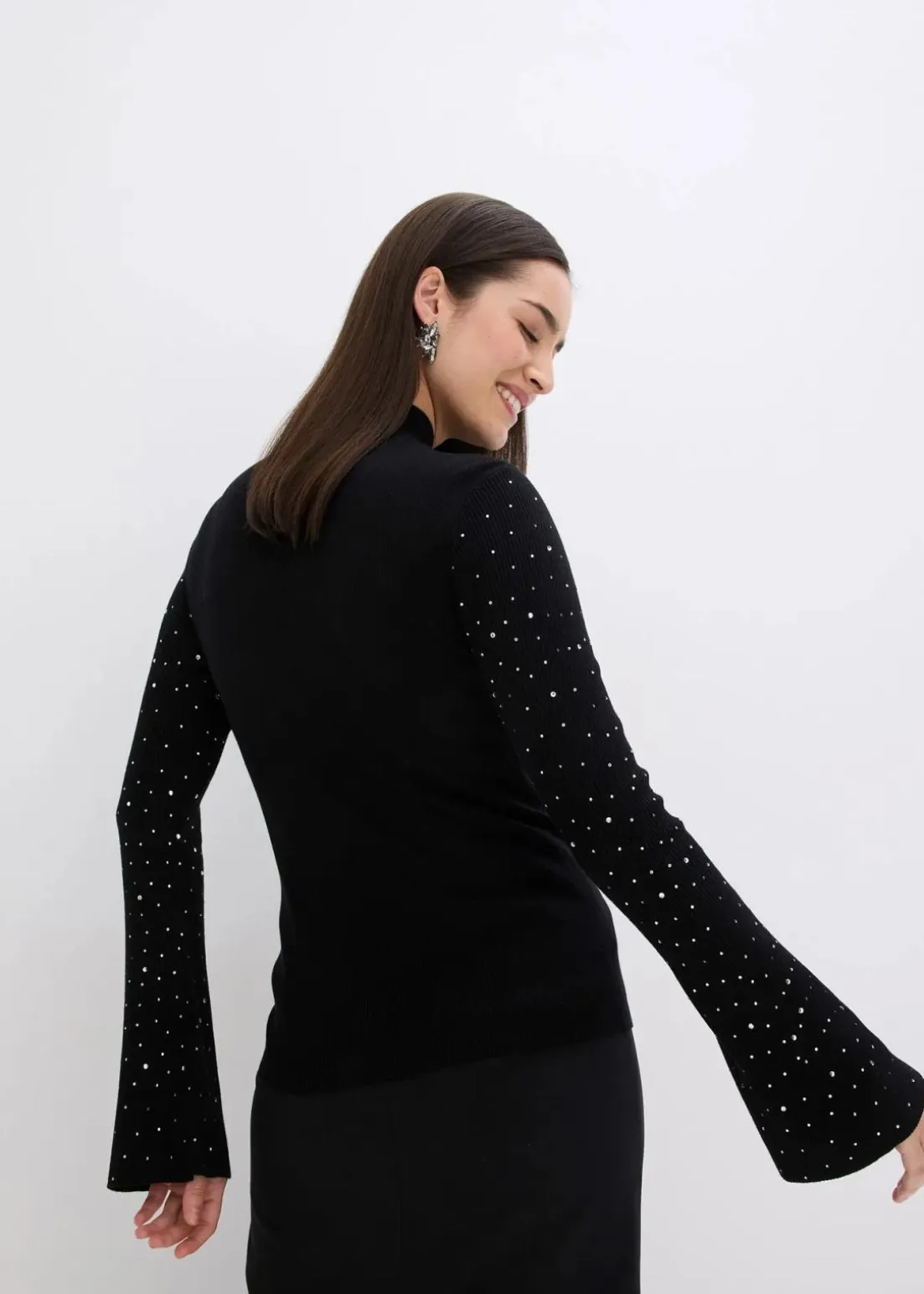 femininer Pullover mit Strass-verzierten Trompetenärmeln