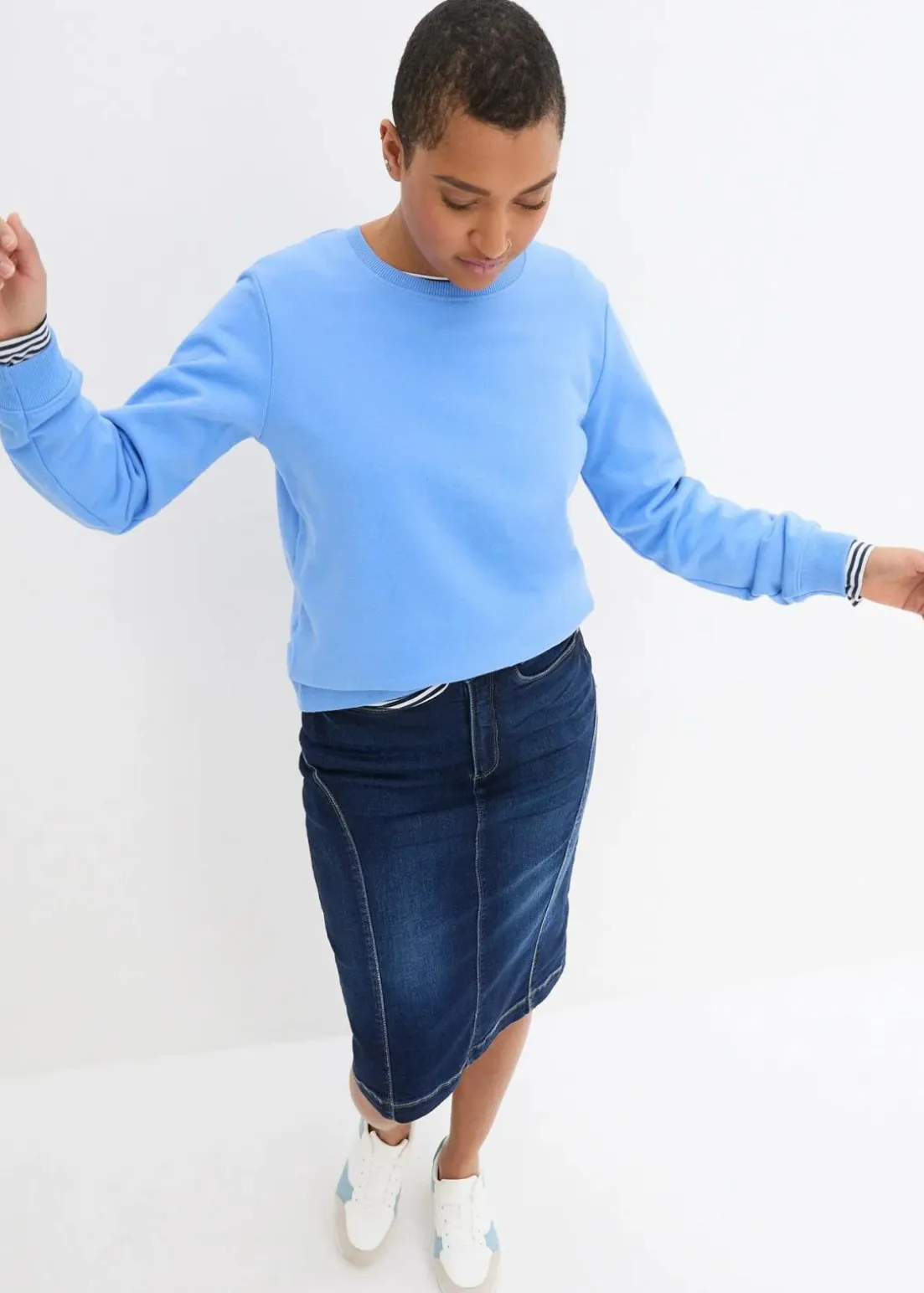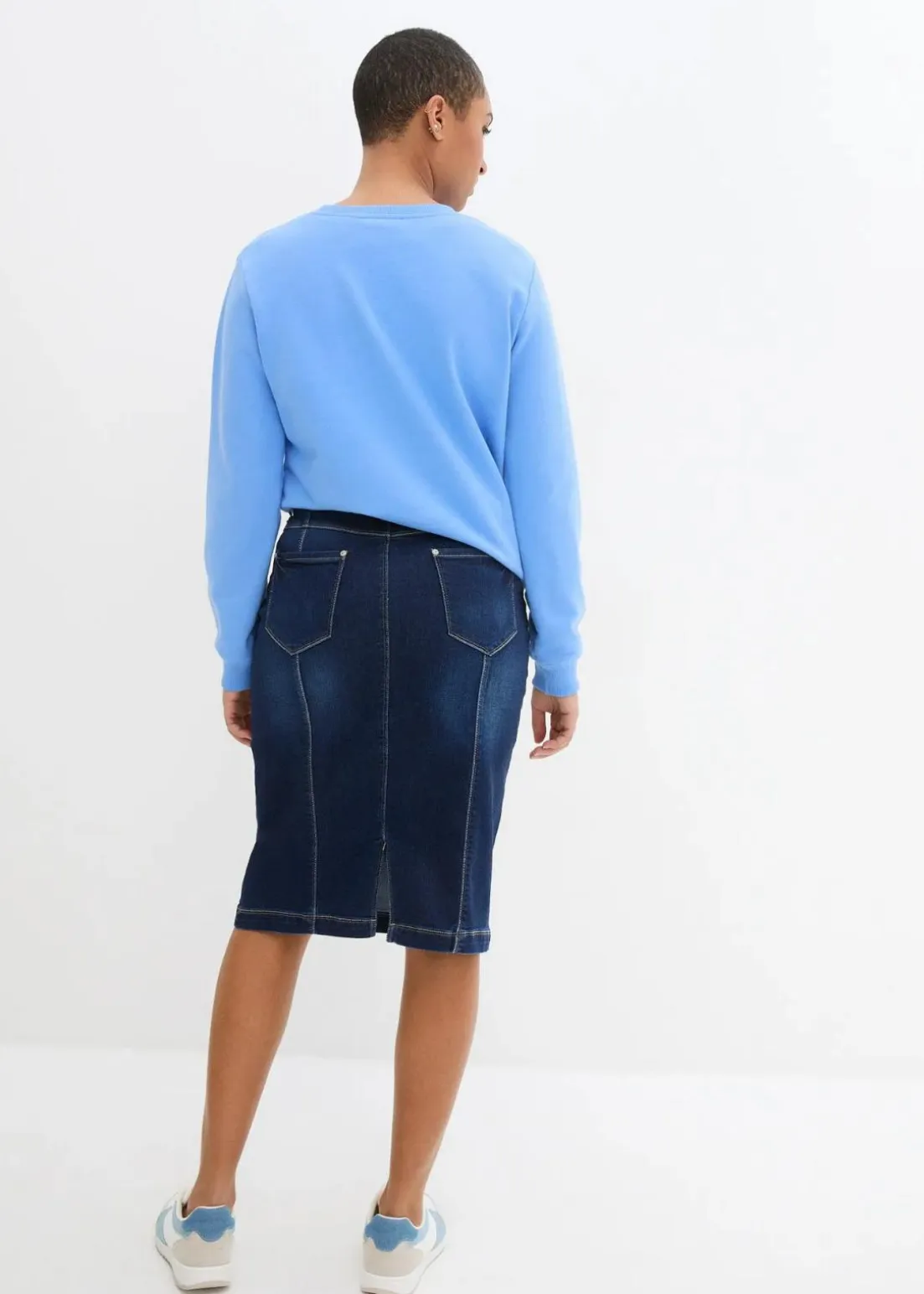 Jeans-Rock mit seitlichen Elastik-Einsätzen am Bund, vorverlegte Nähte für einen Schlankmacher-Effekt