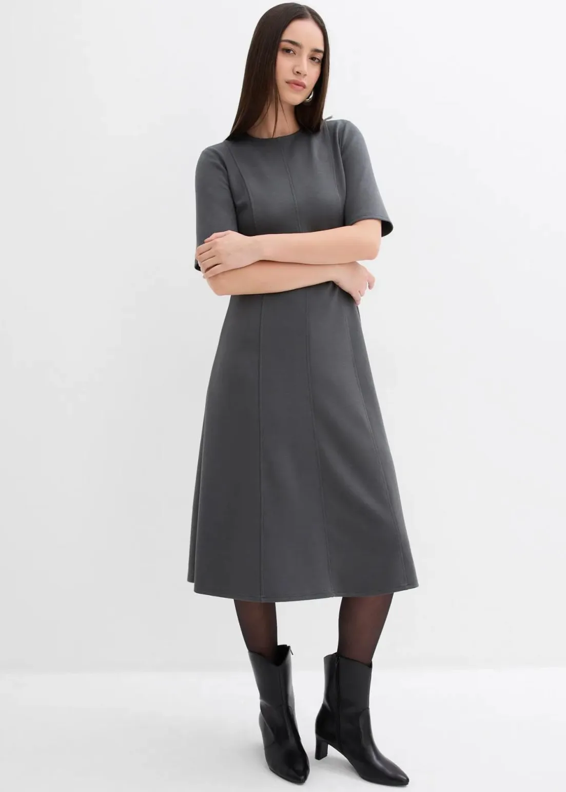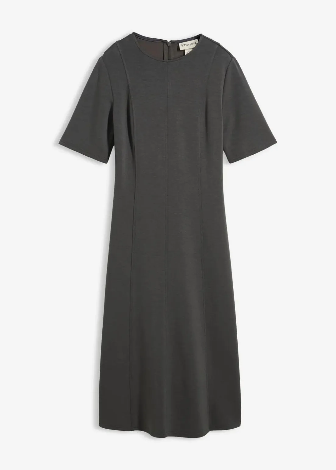 Midikleid mit vertikalen Teilungsnähten sowie einem voluminösem ausgestellten Rock. Verdeckter Reißverschluss hinten.
