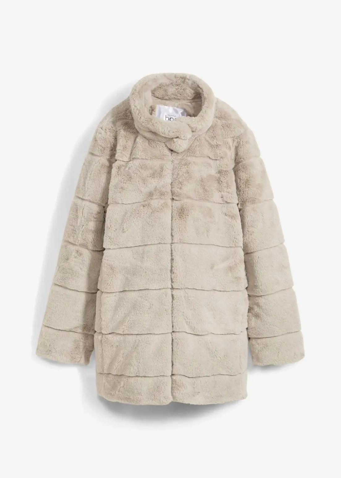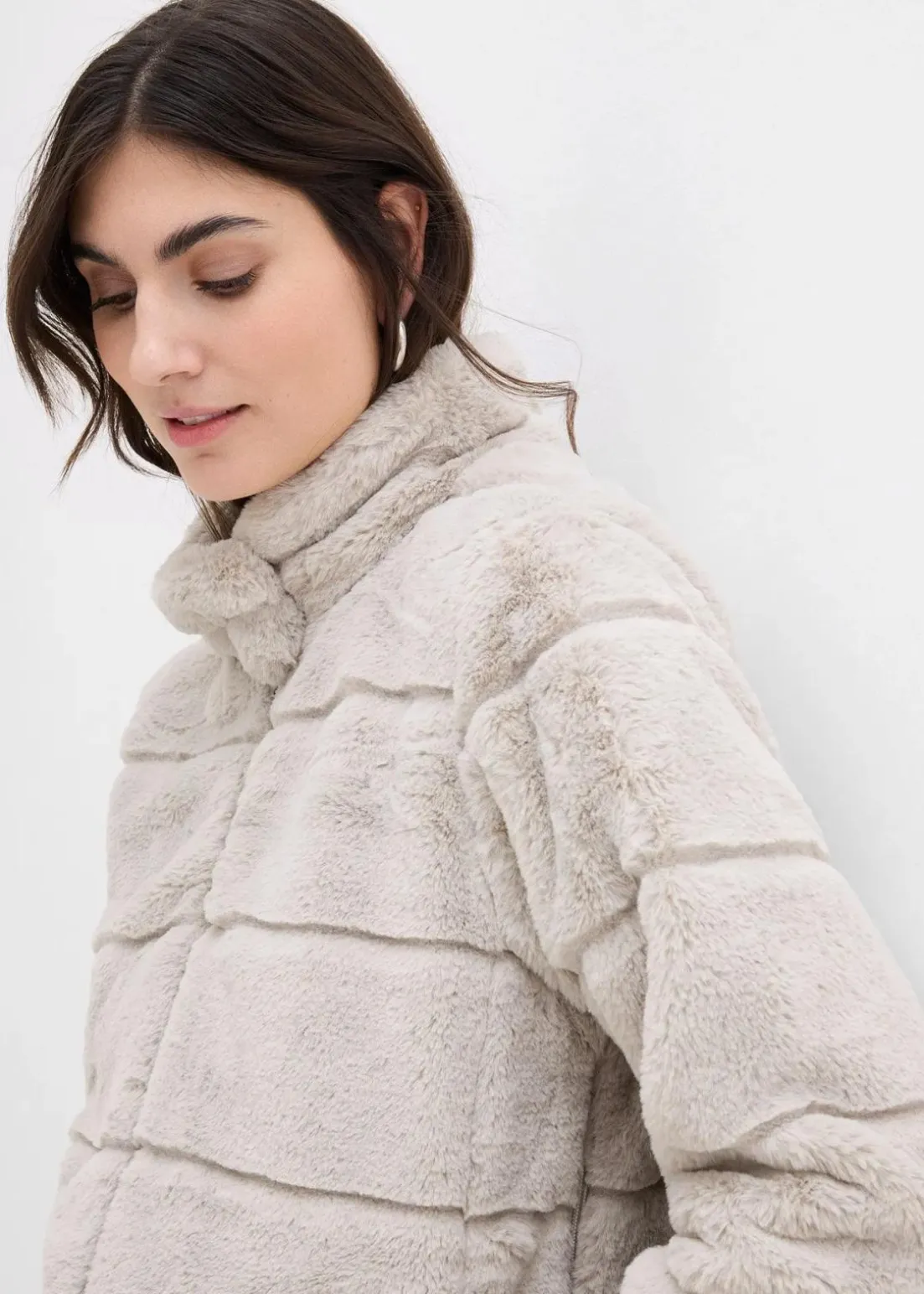 Jacke aus Fellimitat mit durchgehendem Reißverschluss. Seitliche Reißverschlüsse ermöglichen eine flexible Weitenregulierung, sodass die Jacke sowohl während der Schwangerschaft als auch danach getragen werden kann. Hinweis: Das Material kann leicht fusseln. Um dies zu minimieren, empfehlen wir, die Jacke vor dem ersten Tragen im Schonwaschgang zu waschen oder mit einer Fusselbürste zu behandeln.