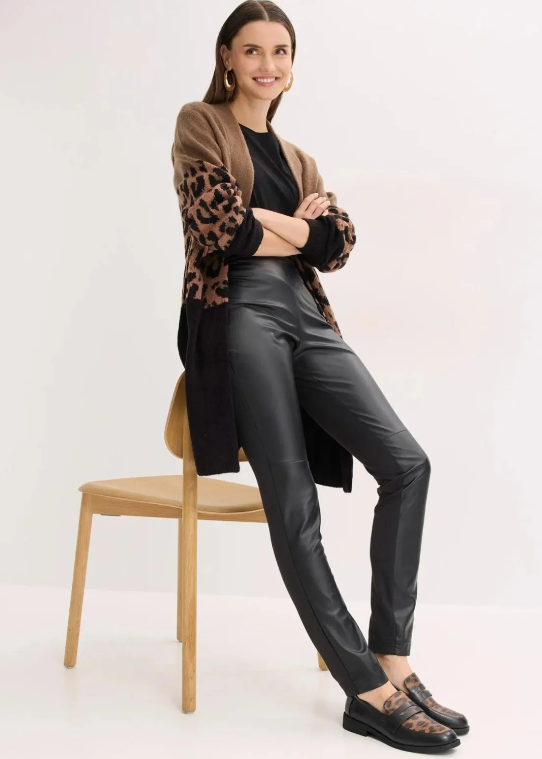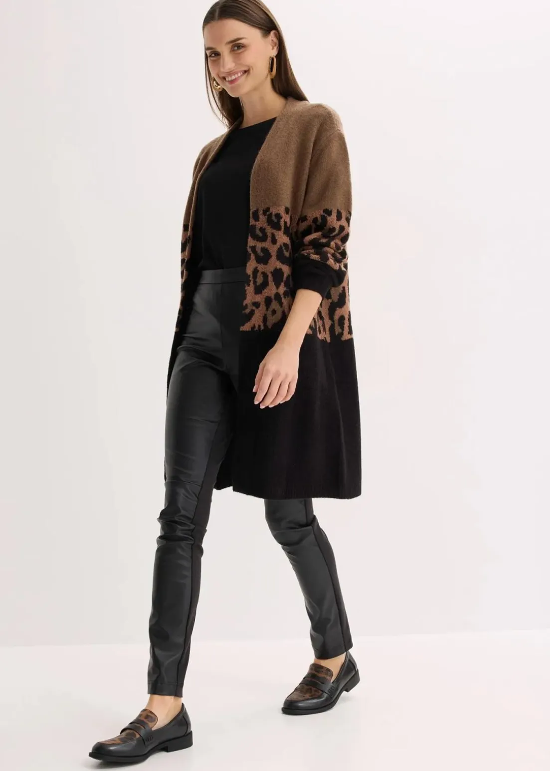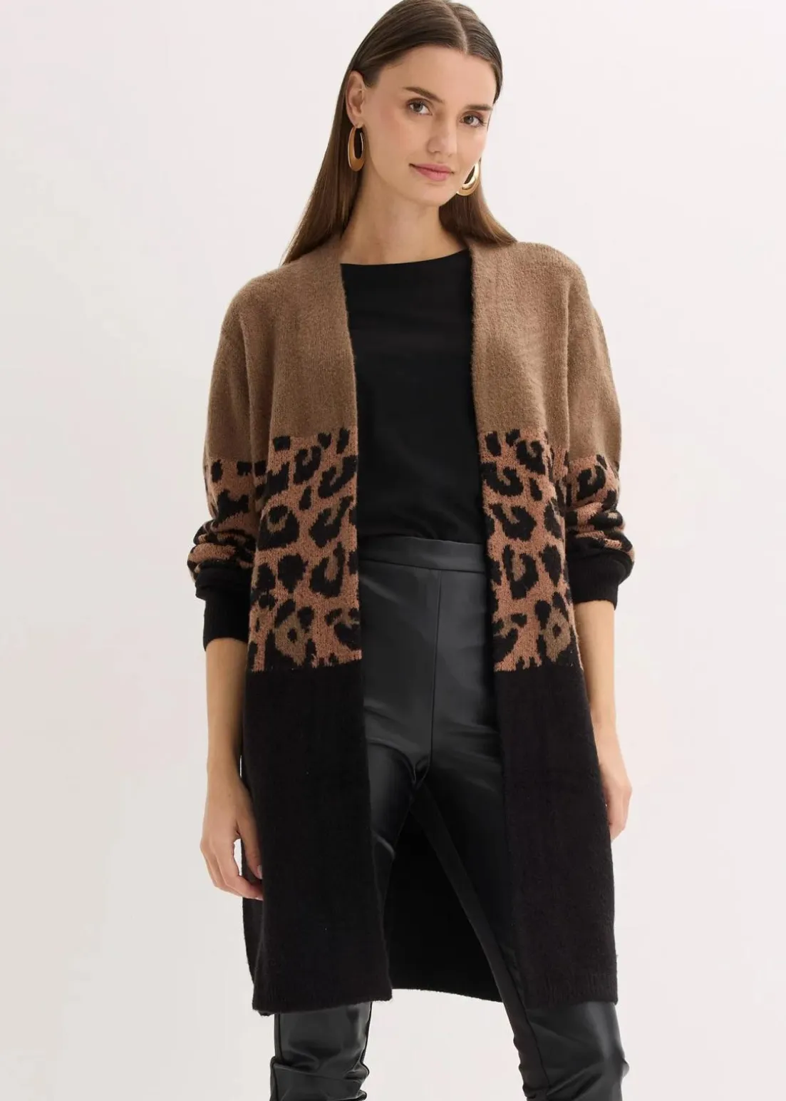 modische Longstrickjacke ohne Verschluss mit Leoparden-Jacquard-Muster