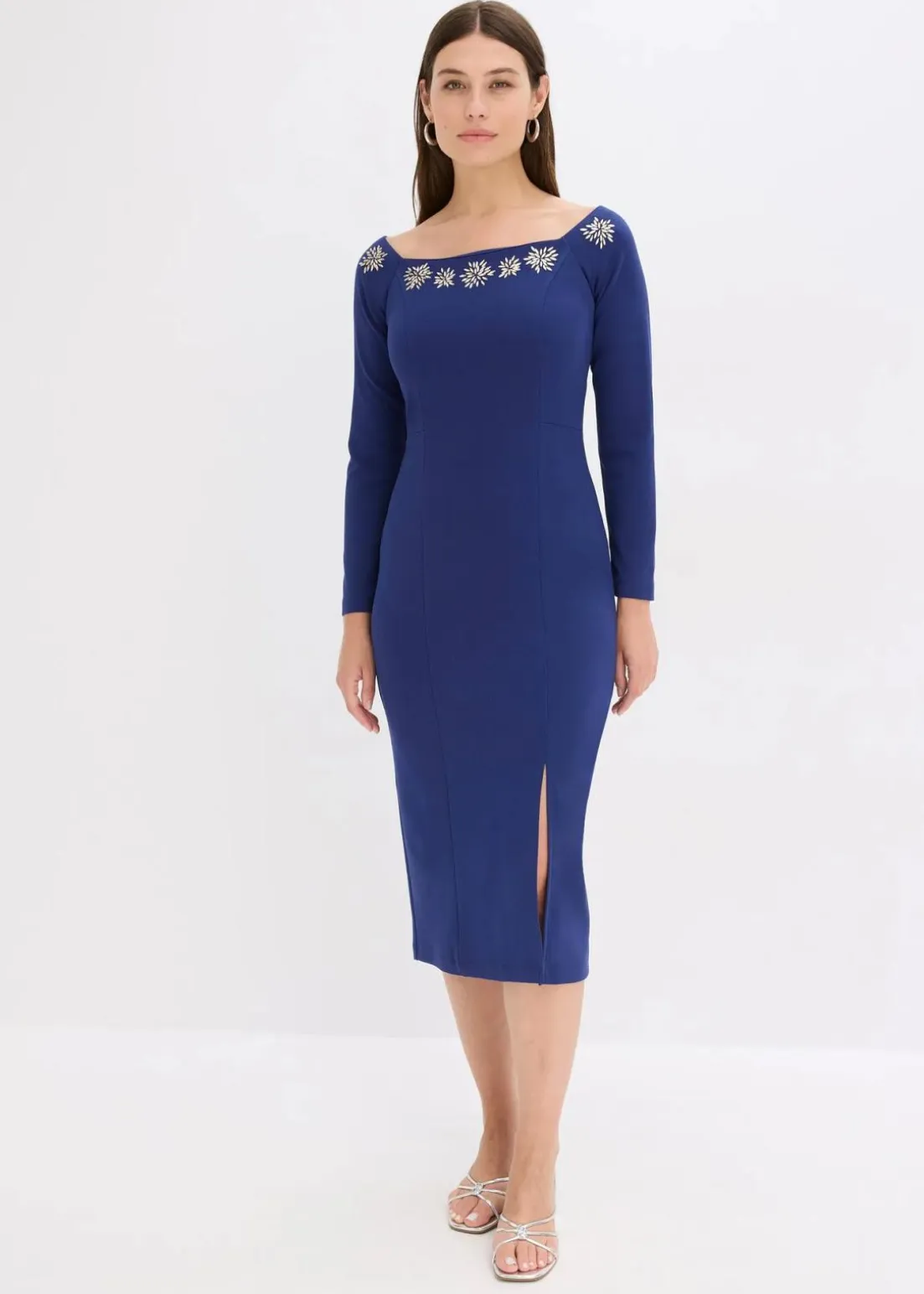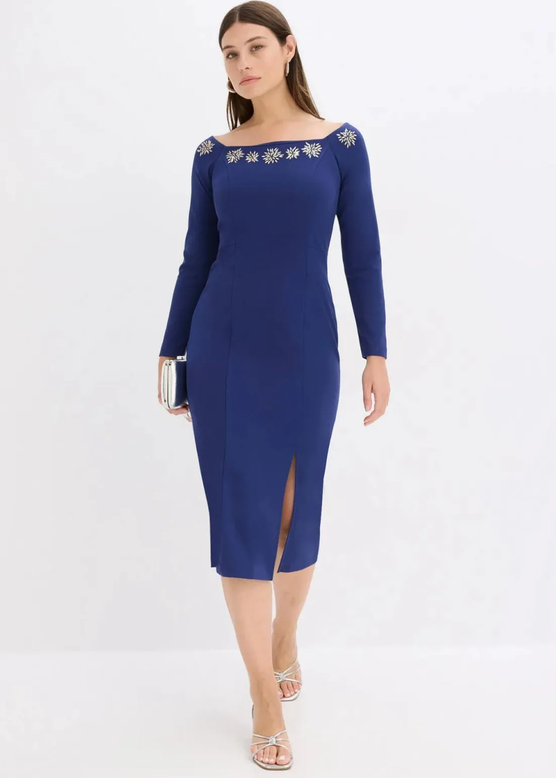 Modern und feminin: Kleid in Maxi-Länge mit Carmenausschnitt und Strassstein-Besatz am Ausschnitt