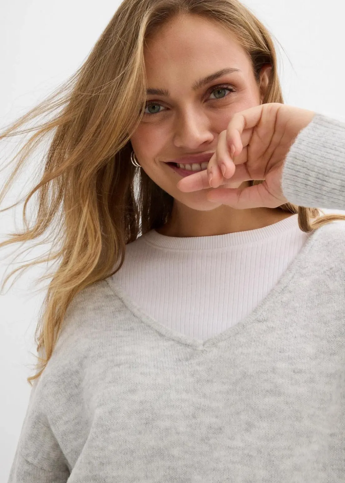 Weit geschnittener Longpullover mit V-Ausschnitt und Seitenschlitzen. Mit Rippbündchen an den Ärmeln und am Abschluss.
