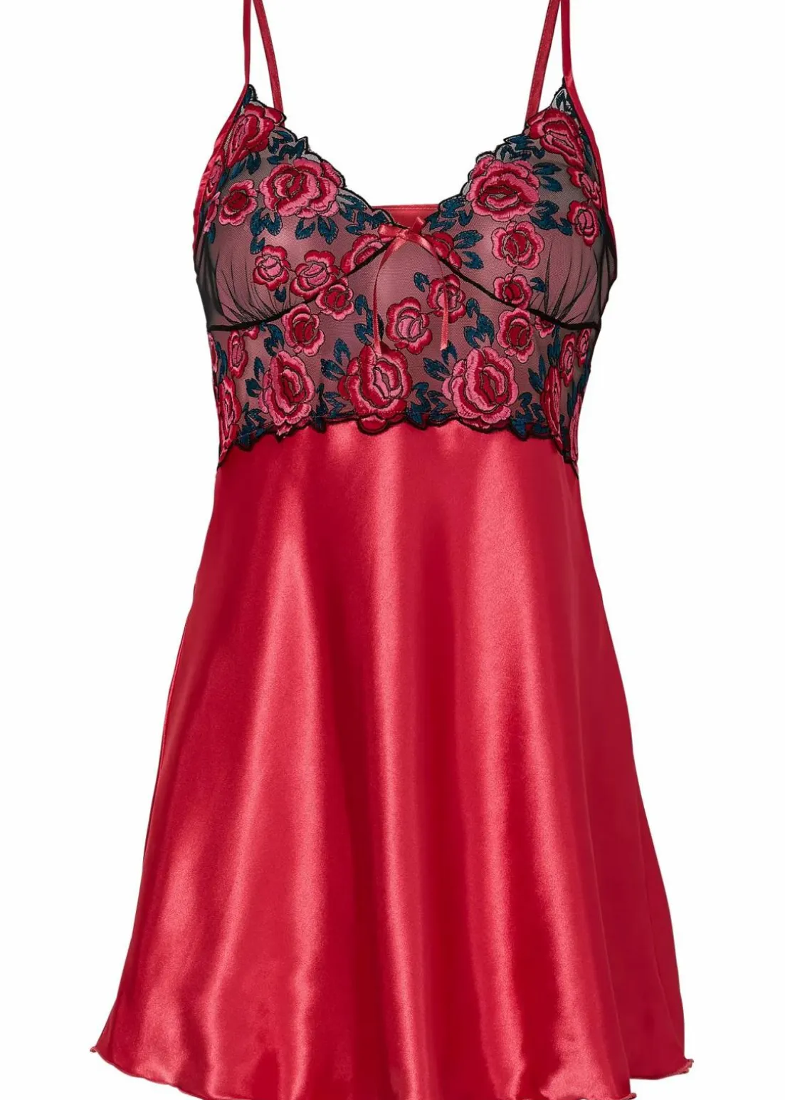 Schöne, zarte Stoffe sorgen für ein angenehmes Körpergefühl und für eine tolle Ausstrahlung. Dieses zauberhafte Negligé aus edel glänzender Satinware liegt leicht auf der Haut.Der obere Teil ist aus filigran gearbeiteter Spitze im Rosendesign gefertigt. Dank der individuell verstellbaren Träger erhält das Negligé eine optimale Passform. Der Rock begeistert durch seinen leichten Fall.