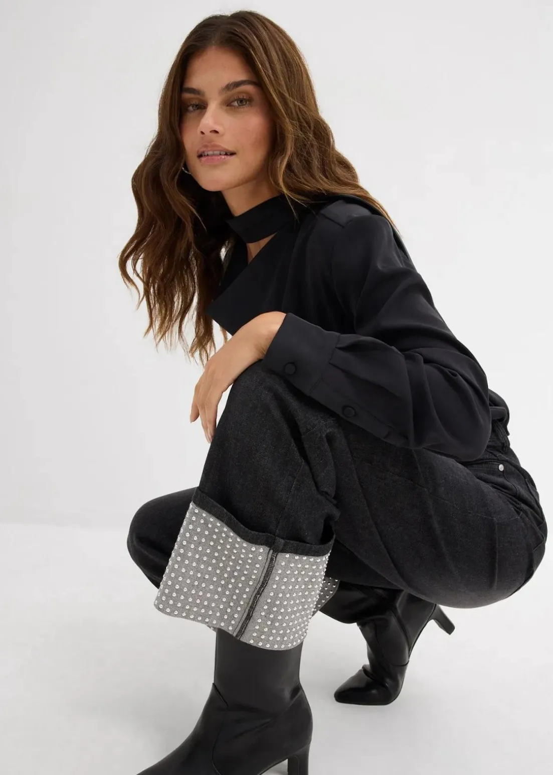 Straight-Jeans High Waist mit Strass besetzen Turn Up