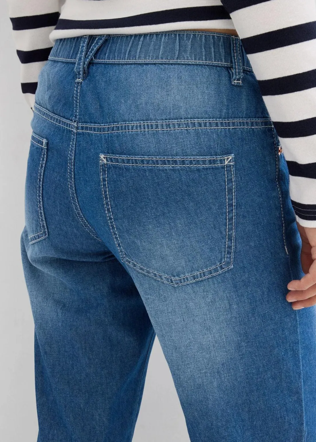 Lockere Gerade 5-Pocket-Jeans mit elastischem Bequembund aus einem festen Baumwolldenim, der sich zunächst etwas steif anfühlt und durch häufiges Tragen weicher und lockerer wird.Mittlere Bundhöhe mit Zip Fly und Knopf. Cropped Länge. Innenbeinlänge in Gr. 42 ca. 64,5 cm, maschinenwaschbar.