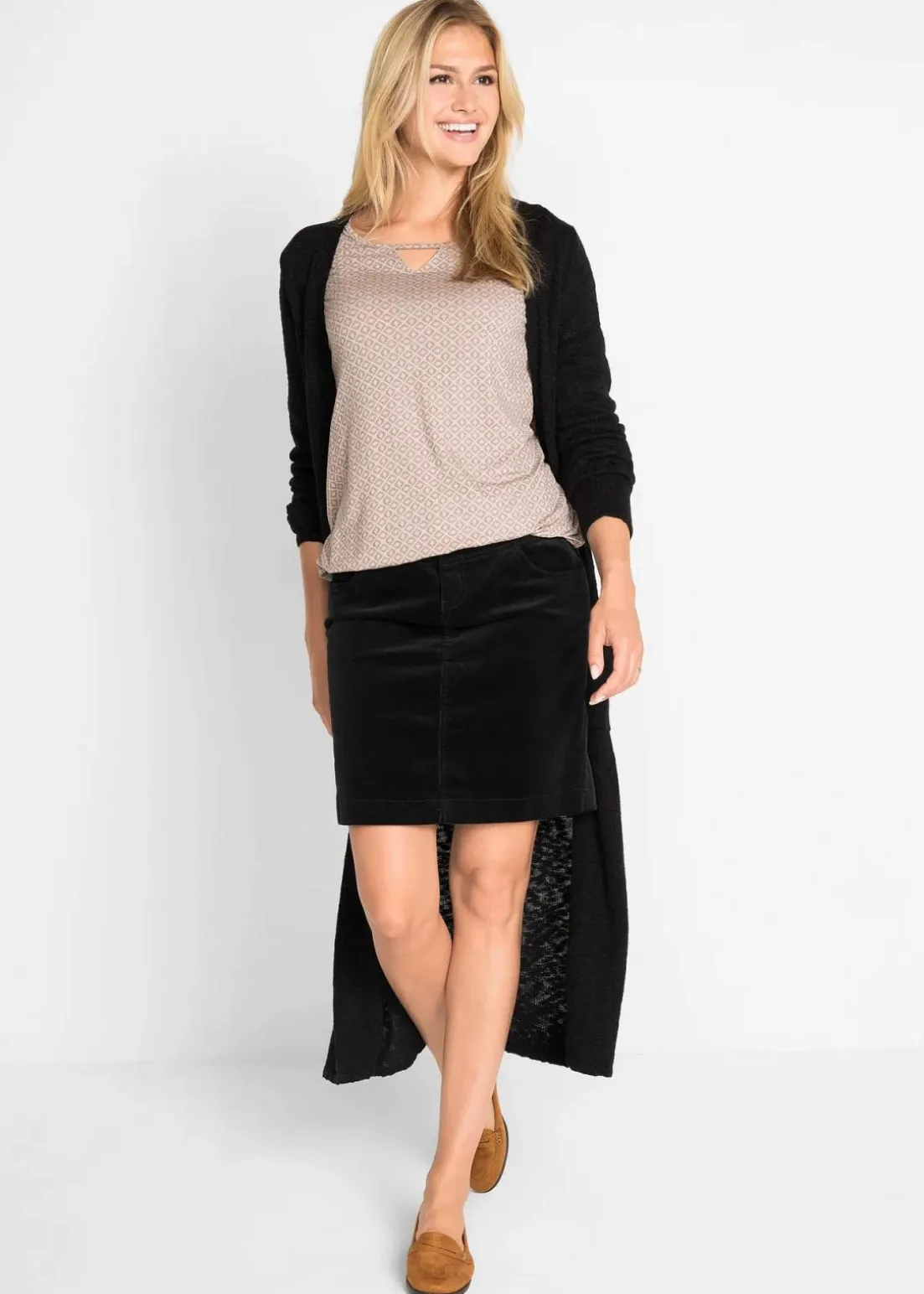 Der figurbetont geschnittene Cordrock aus der Kollektion von bpc begleitet Damen modisch durch den Winter. Der Cordrock ist aus angenehmem Stretchmaterial gearbeitet und lässt sich vorne mit zwei Knöpfen schließen. Der 4-Pocket-Schnitt und der raffinierte Gehschlitz auf der Rückseite unterstreichen die moderne und zugleich legere Optik.Der komfortable Rock lässt sich am besten zu kurzen Oberteilen, Strumpfhosen und Stiefeln kombinieren.