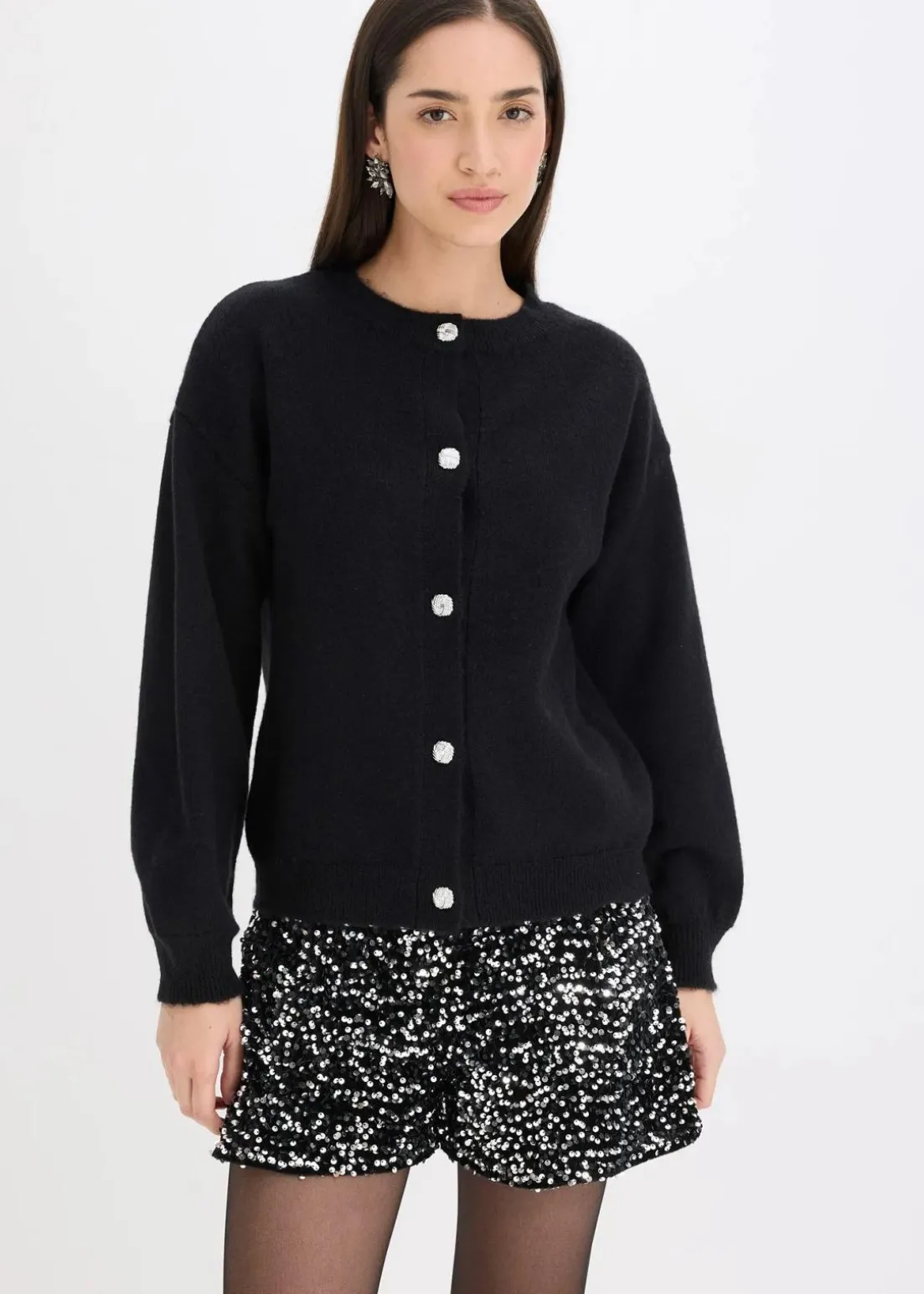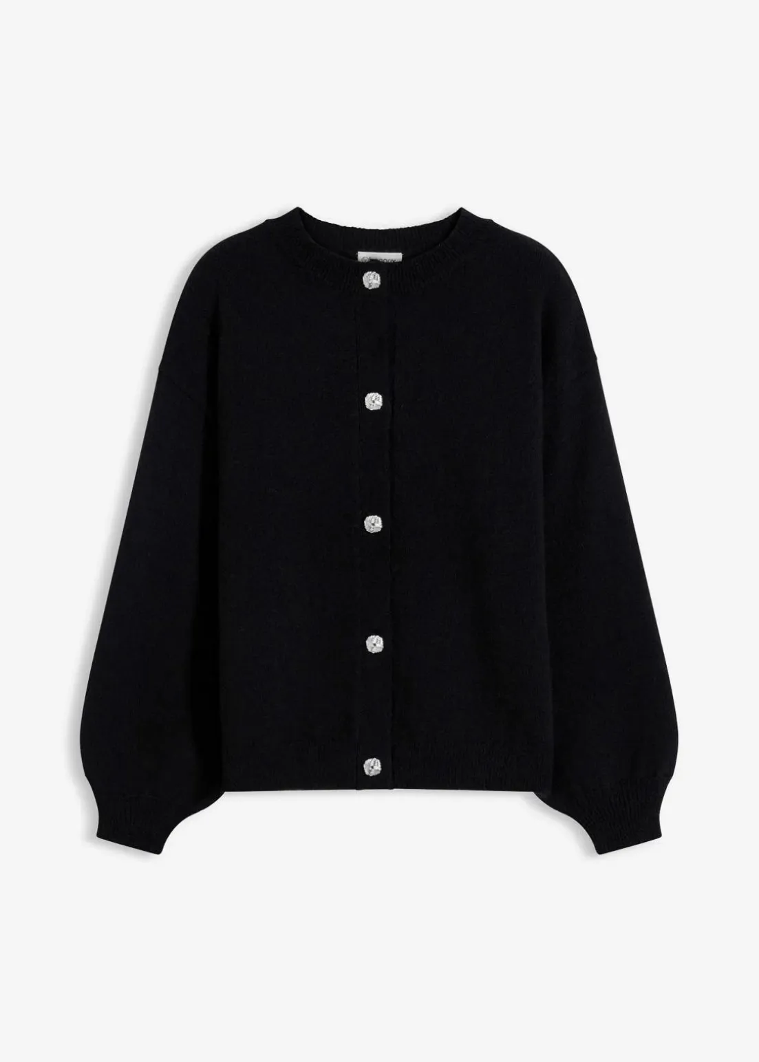 Jacke aus einfarbigem Strick mit Rundhalsausschnitt und langen Ballonärmeln. Verschluss vorne mit dekorativen Metallknöpfen