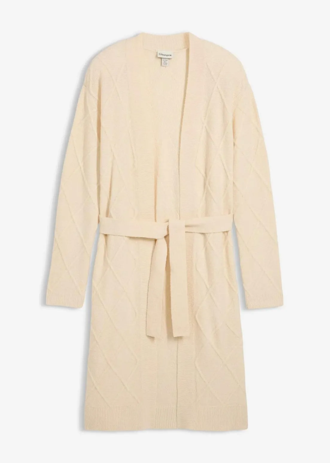 Langer Strickmantel aus Zopfstrick. Modell mit überschnittenen Schultern und Bindegürtel.