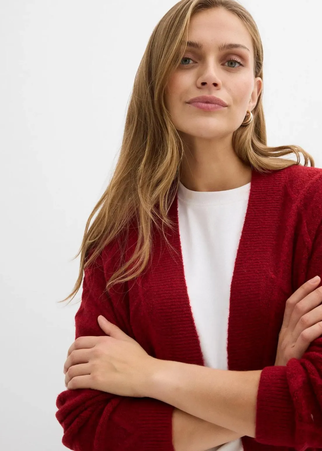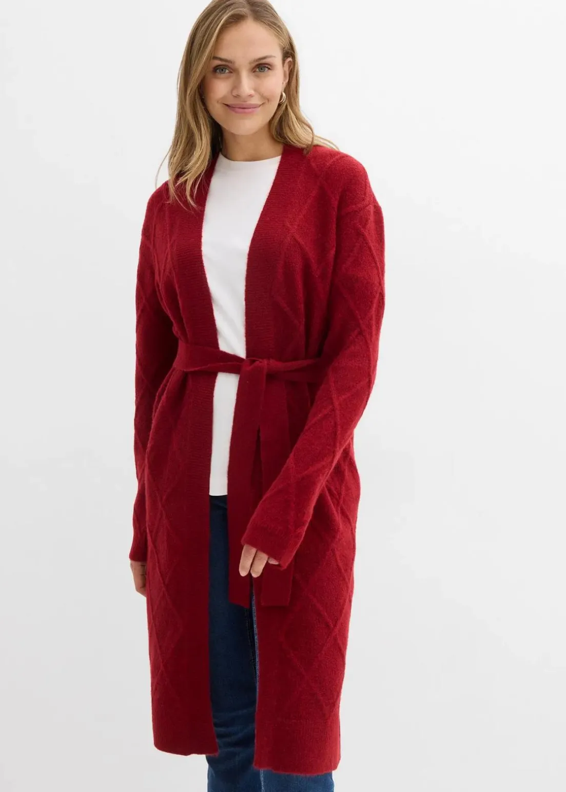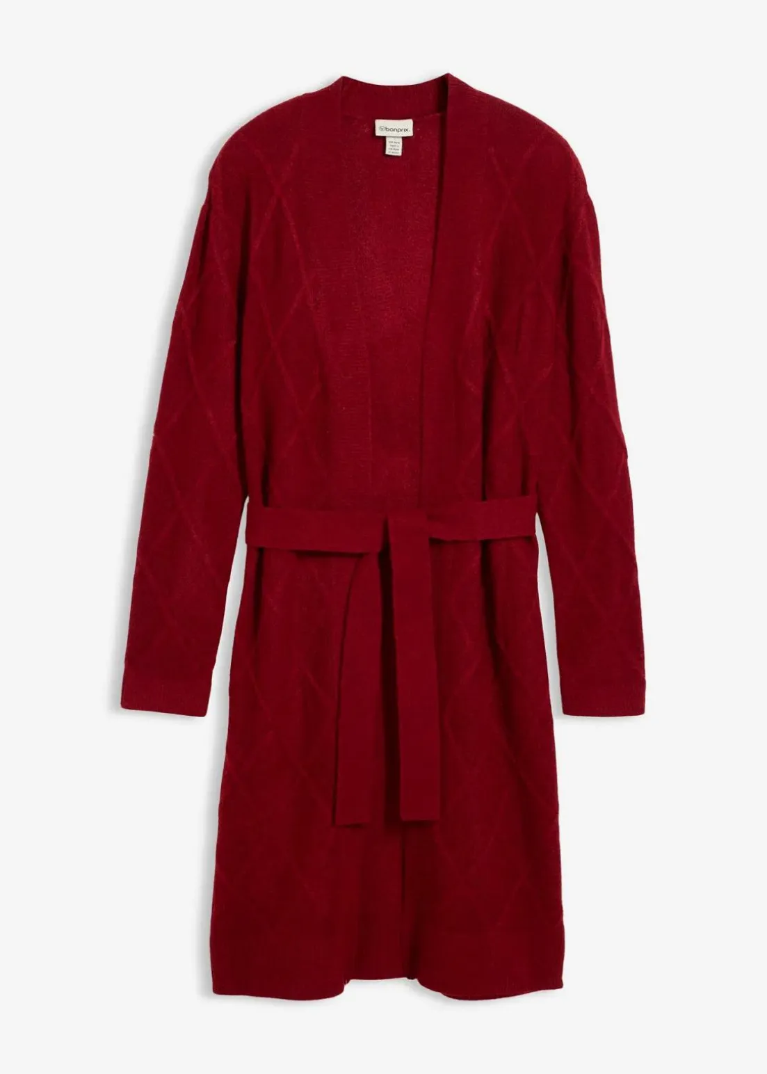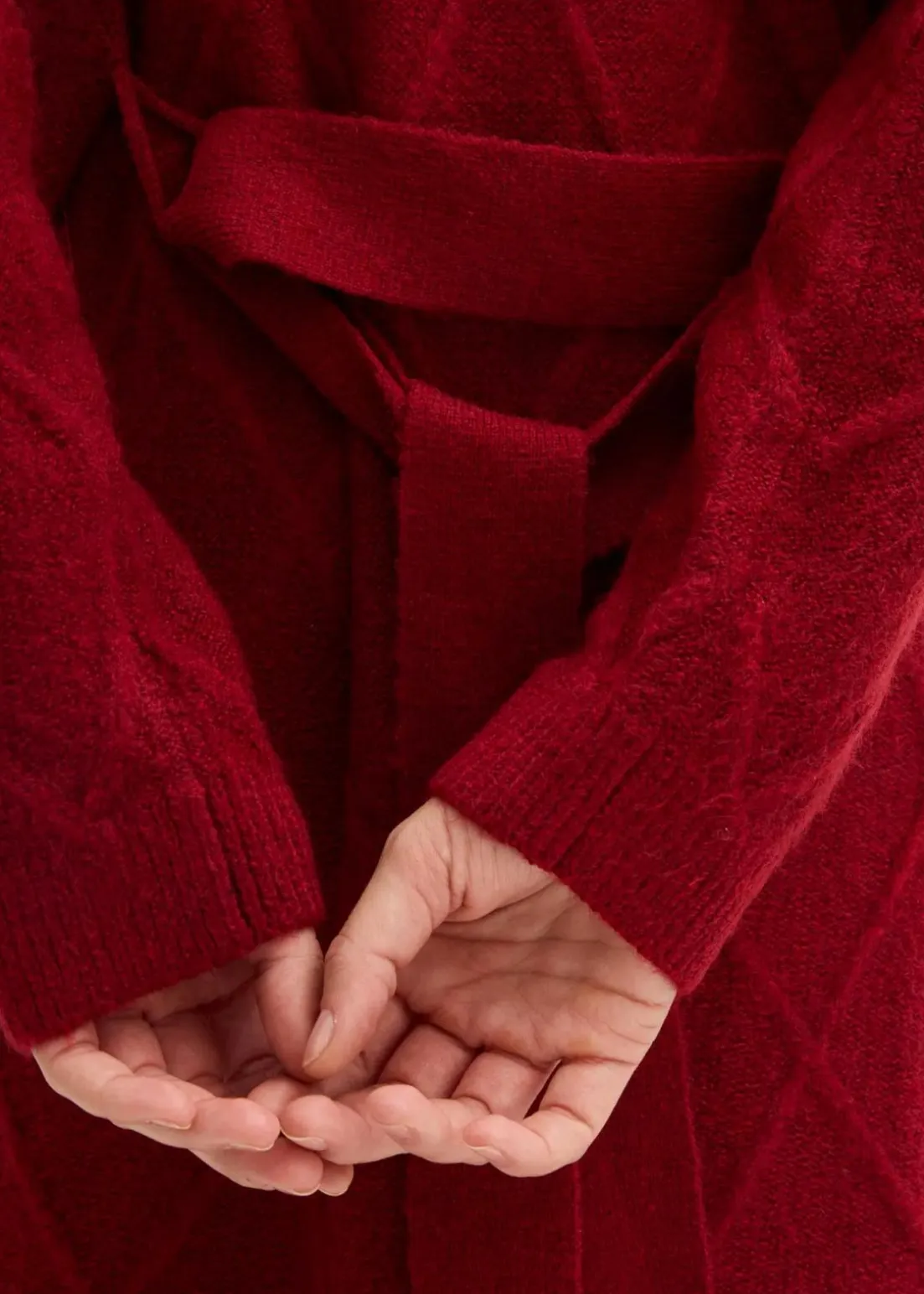 Langer Strickmantel aus Zopfstrick. Modell mit überschnittenen Schultern und Bindegürtel.