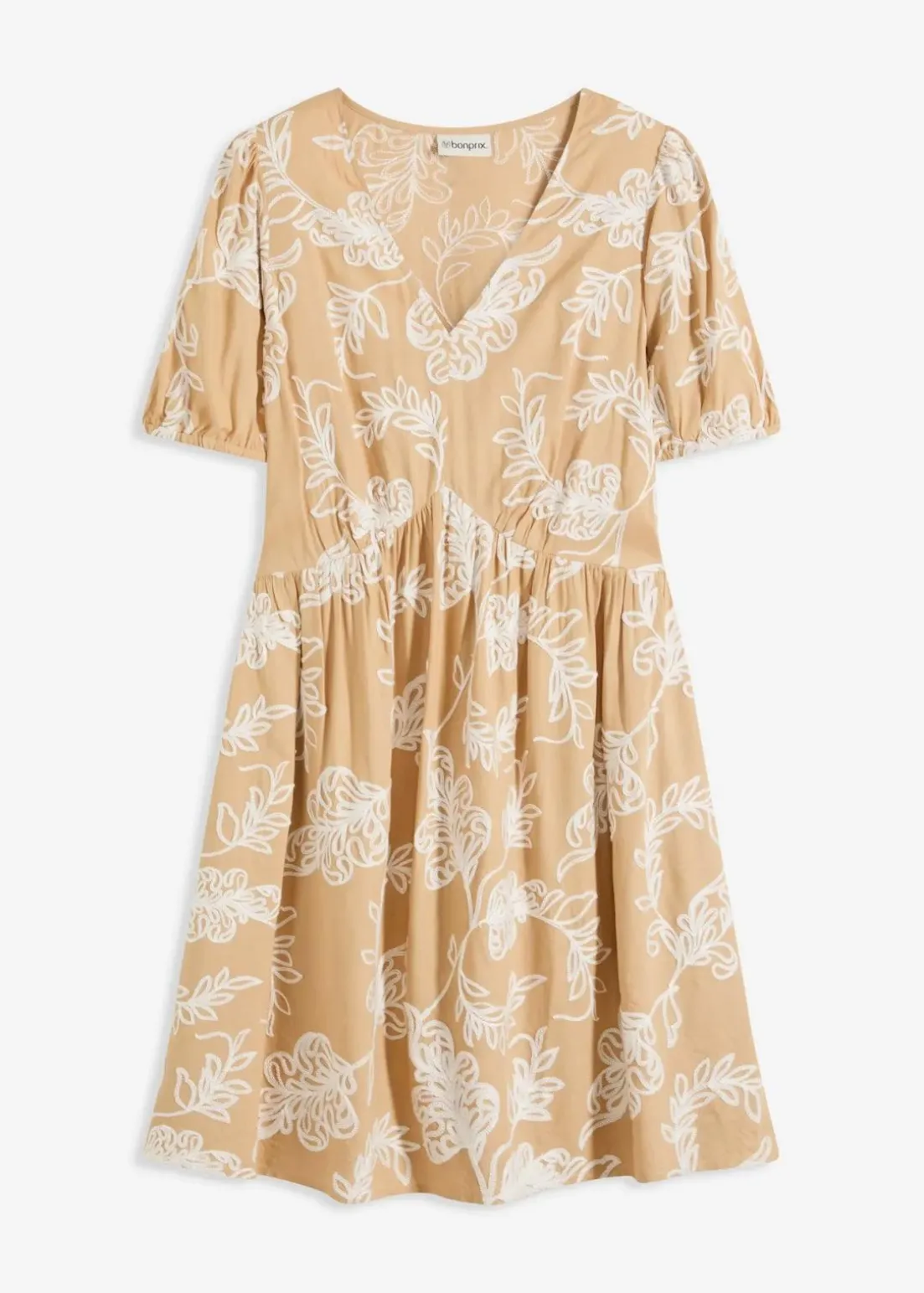 modisches Tunika-Kleid aus fließender Viskose mit dekorativer Stickerei und kleinen Puffärmeln