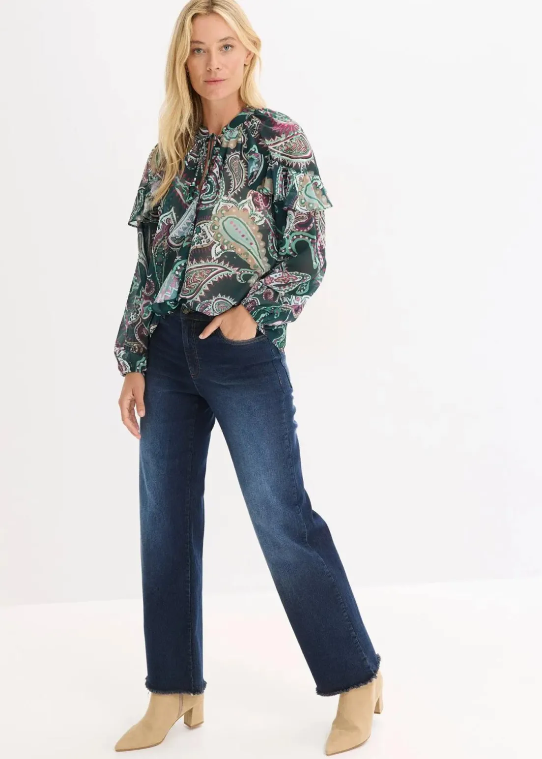 modische Tunikabluse mit dekorativen Volants und Bindeband-Detail vorne am Ausschnitt