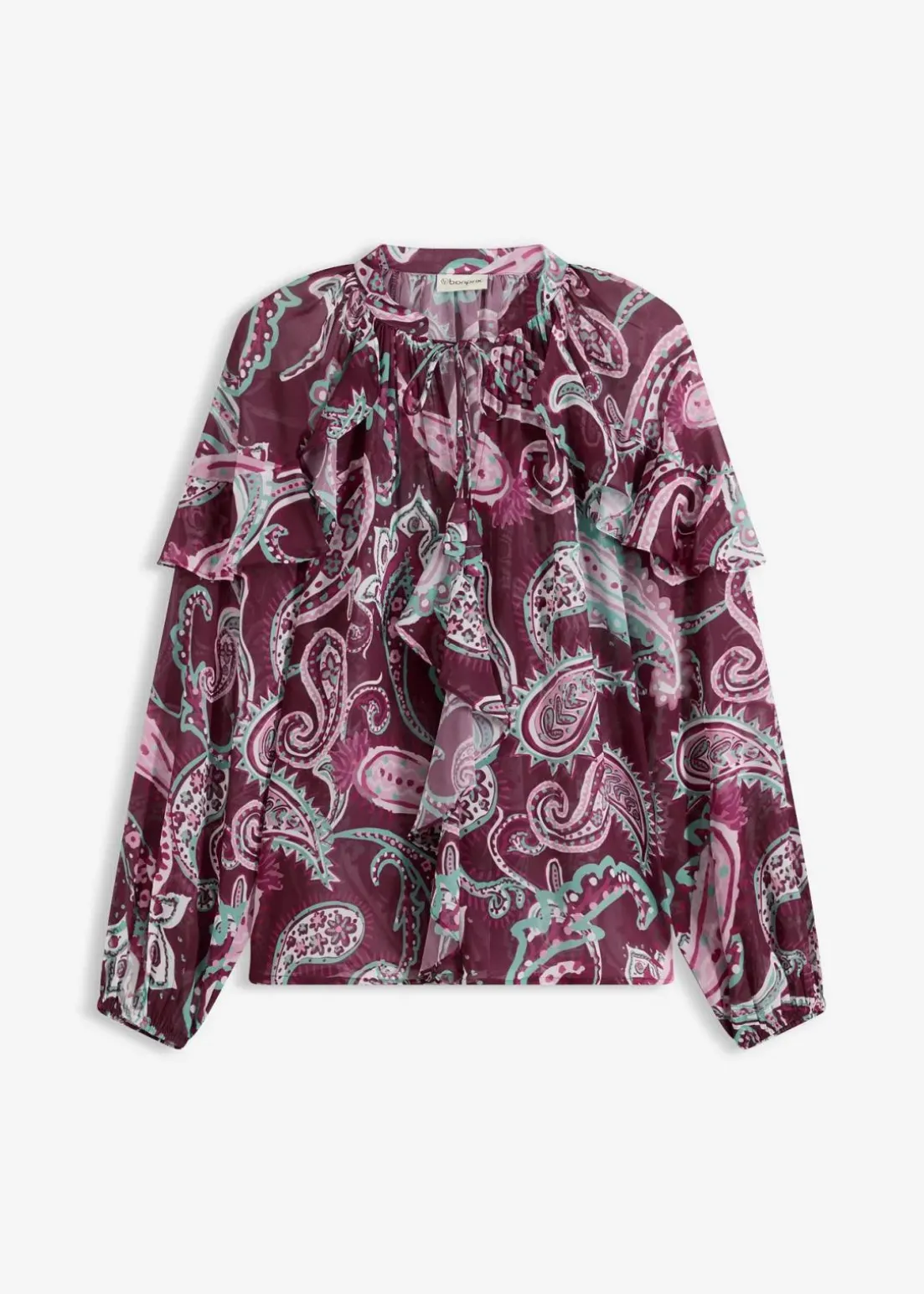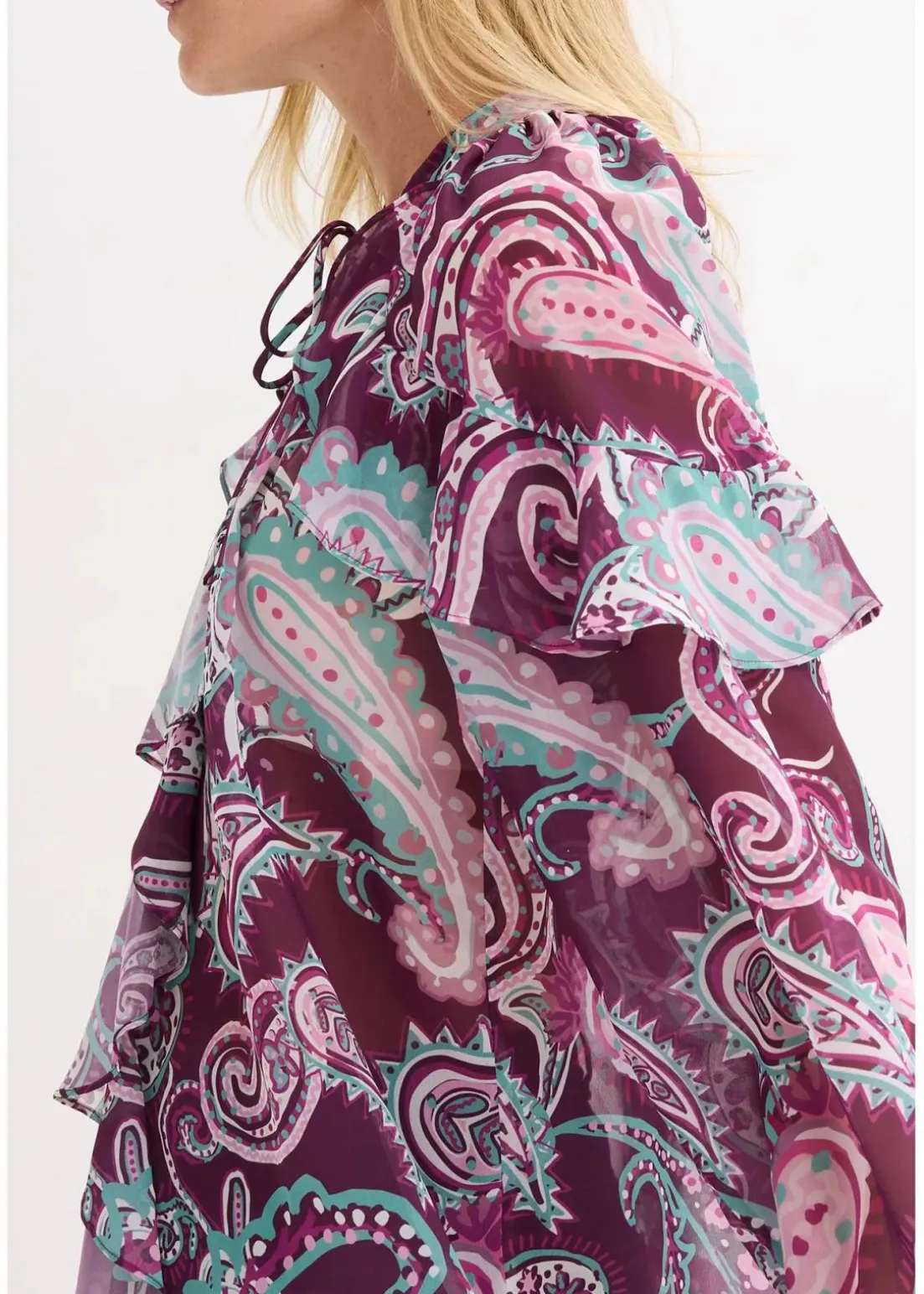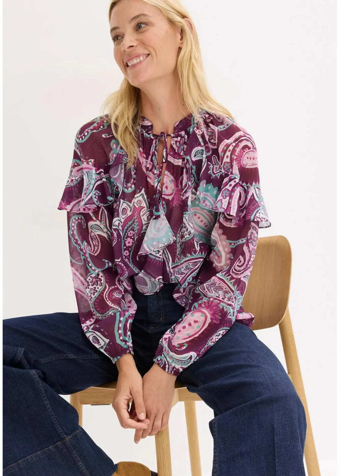 modische Tunikabluse mit dekorativen Volants und Bindeband-Detail vorne am Ausschnitt