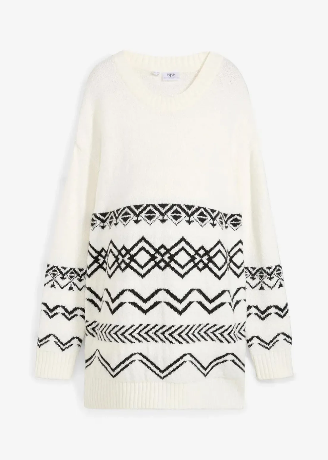 Weicher Umstandspullover aus einer Baumwollmischung mit Norwegermuster. Dekrorative Druckknöpfe an beiden Seitennähten bieten eine praktische und diskrete Stillfunktion und können zur Erweiterung des Pullovers genutzt werden.