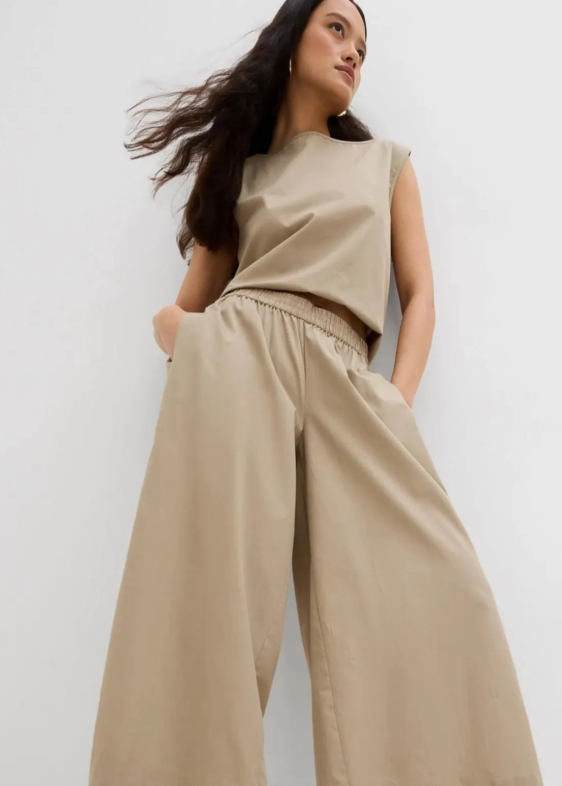 Culottes mit besonders weitem Bein, einem bequemen Gummibund sowie vorderen Seitennahttaschen und aufgesetzten Gesäßtaschen